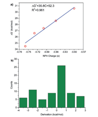 | Fig. 4. (a) Linear relationship between energy barrier of 35-ts (kcal/mol) and NPA charge of Cl in intermediate 34. (b) The error distribution of barrier obtained from the linear-fitting formula for 73 anions coordinating complexes used as catalyst. | |