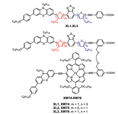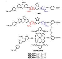 The synthetic procedures for XL1−XL3 and XW74−XW76 are illustrated in Scheme S1 (Supporting information). The dye precursors were obtained via Sonogashira and Suzuki coupling reactions. Subsequent hydrolysis reactions under alkali conditions afforded the final dyes. The structures of all new compounds have been characterized by NMR and mass spectra, see details in Supporting information.