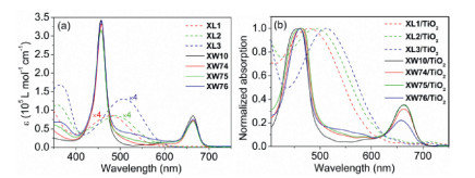 Upon adsorption onto the TiO2 films (Fig. 2b), XL1−XL3 and XW74−XW76 show broadened bands, which facilitate the light harvesting in the DSSCs. Notably, the absorption spectra exhibit negligible blue shift upon adsorption, compared with those in the solutions, indicating the absence of notable aggregation on the TiO2 films [32].