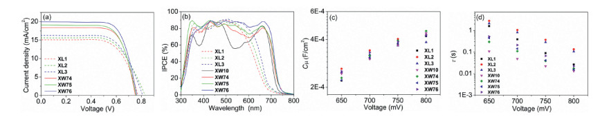 | Fig. 3. (a) J−V characteristic curves, (b) IPCE spectra, plots of (c) Cμ and (d) τ versus the bias voltages of the DSSCs based on the sensitizers. | |