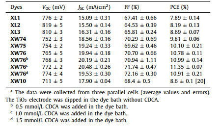 Table 1 Photovoltaic performance of DSSCs based on XL1-XL3, XW74-XW76 and the reference dye XW10.a |