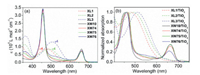 | Fig. 2. Absorption spectra of the sensitizers (a) in THF solutions, and (b) adsorbed on TiO2 films (2 µm). | |