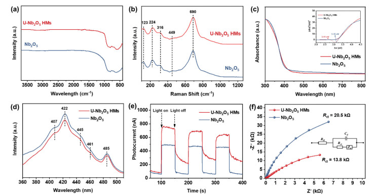| Fig. 2. (a) FT-IR spectra, (b) Raman spectra, (c) UV–vis spectra (inset Tauc plot), (d) PL spectra, (e) transient photocurrent response and (f) the electrochemical impedance spectra of U-Nb2O5 HMs and Nb2O5 (the equivalent circuit impedance model inset). | |