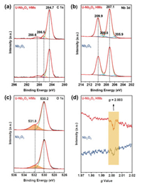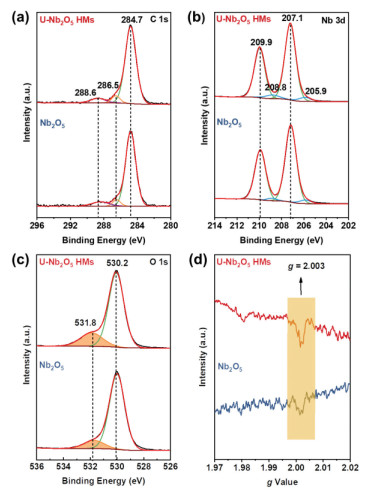 | Fig. 3. XPS high resolution spectra of (a) C 1s, (b) Nb 3d, and (c) O 1s of U-Nb2O5 HMs and Nb2O5. (d) EPR spectra of U-Nb2O5 HMs and Nb2O5. | |