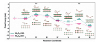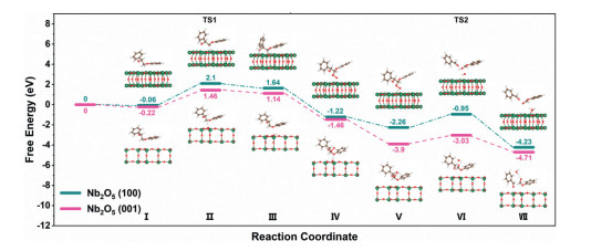 | Fig. 4. DFT-calculated potential energy profiles and configuration diagrams of reactants, transition states, and products on the Nb2O5 (001) [pink] and Nb2O5 (100) [green] models. | |