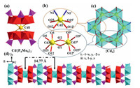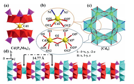 | Fig. 1. (a) Polyhedral view of hourglass-type Cd{P4Mo6}2 cluster in 1. (b) Coordination environments of three kinds of Cd centers in 1. (c) Polyhedral view of ring-shaped hexa-nuclear {Cd6} cluster in 1. (d) 1-D inorganic chain-like structure of 1. Organic moiety and water molecules were omitted for clarity. | |