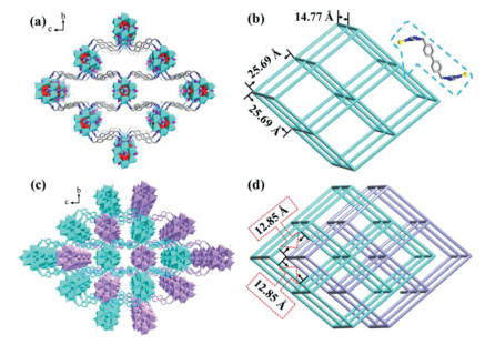 | Fig. 2. (a) Ball-and-stick and polyhedral views of the 3-D framework of 1. (b) Schematic view of pcu topology framework. (c) The two-fold interpenetrating frameworks in 1. (d) Schematic topology view of the crystal structure. | |