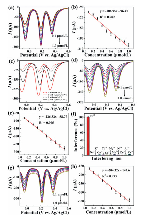 | Fig. 4. (a) DPV curves of compounds 1-modified electrodes in 0.5 mol/L H2SO4 with continuous addition of Cr(Ⅵ). (b) Its corresponding linear dependences of 1. (c) DPV curves of 1 and 2 in 0.5 mol/L H2SO4 with the addition of 1.0 µmol/L Cr(Ⅵ) under visible light illumination. (d) DPV curves of 1 with continuous additions of Cr(Ⅵ) under the visible light illumination. (e) The linear dependence curve of 1; (f) Current interference of 1 towards Cr(Ⅵ) with different interferents of 400 µmol/L Na+, K+, Ca2+, Cd2+, Co2+, Mg2+, Mn2+, Ni2+, Zn2+, Al3+, Cr3+and their mixture with 40 µmol/L Cr(Ⅵ), respectively. (g) DPV curves of compound 1 in acidified lake water with continuous additions of Cr(Ⅵ). (h) The linear dependence curve of 1. | |