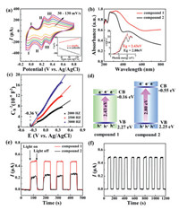 | Fig. 3. (a) CV curves of 1 at different scan rates. (b) UV-vis diffuse reflection spectra of 1 and 2. Insert: the corresponding plot of the (αhν)2 versus hν. (c) Mott–Schottky plots of 1 in 0.2 mol/L Na2SO4 solution at pH 6.80. (d) Energy diagram of the HOMO and LUMO levels of 1 and 2. (e) Transient photocurrent response of 1 and 2. (f) Stability of the transient photocurrent under periodic off-on-off light for 10 cycles. | |