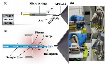 | Fig. 1. The schematic diagram (a), photos (b), and ionization mechanism diagram (c) of TAAEAI-MS setup. d1 is the distance between the needle tip and the arc, and d2 is the distance between the needle tip and MS inlet. | |