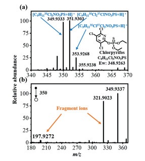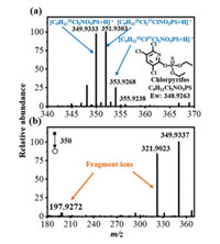 | Fig. 2. The MS (a) and MS/MS (b) spectra of chlorpyrifos (10 µg/g) recorded by TAAEAI-MS. The error is within the tolerance range of 10 ppm. | |