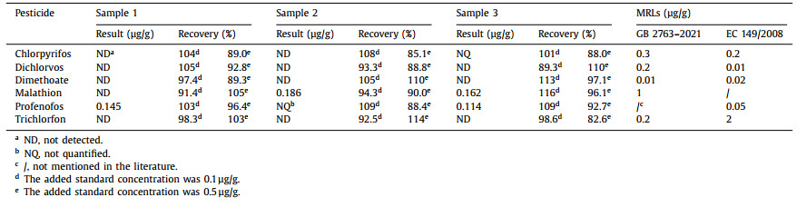 Table 2 The contents and recoveries of 6 organophosphorus pesticides in 3 strawberry samples and the MRLs of GB 2763–2021 and EC 149/2008. |