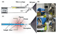 Electric arc based MS is a new AMS technique developed in 2020. Arc plasma dissociation MS (APD-MS) was used to detect fingerprint under atmospheric condition [36]. High energy and voltage of APD can desorb and ionize target molecules. Then, the team used APD to split and ionize the polymer, and obtained the structural information of the polymer through fingerprint analysis [37]. Ambient electric arc ionization MS (AEAI-MS) with a soft ionization source is a novel, versatile AMS technique to analyze compounds with a wide range of polarities [38]. Notably, AEAI only requires an open arc for ionization without laser and gas input. AEAI realizes the analysis of samples in solid, semi-solid, liquid, and gaseous states, and has good salt and matrix tolerances [39]. Besides, a portable MS ionization source named "MasSpec Pointer" with a mass of only 65 g was recently developed and used for the positioning of fatty acid carbon-carbon double bonds and the rapid detection of pesticides [40].