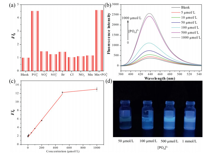 | Fig. 2. (a) The FL response with various anions (100 µmol/L for each). (b) The FL intensity with 0–1 mmol/L [PO4]3−. (c) Linear plots of enhanced FL intensity from ZrT-1-NH2 solution as a function of phosphate concentration. (d) The photographs of FL intensity of ZrT-1-NH2 at different phosphate concentrations, excited at 365 nm. | |