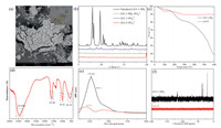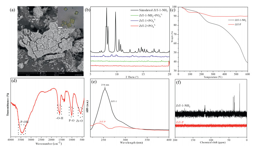 | Fig. 5. (a) The SEM image of ZrT-P, inset: the photography of ZrT-1-NH2, scale bar 5 µm. (b) The PXRD of derivatives from three Zr-MOCs and phosphate. (c) The TGA data of ZrT-1-NH2 and ZrT-P. (d) FTIR of ZrT-P. (e) UV absorb spectrum of ZrT-1 and ZrT-P. (f) The 13C NMR spectrum of ZrT-1-NH2 and ZrT-P. | |