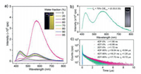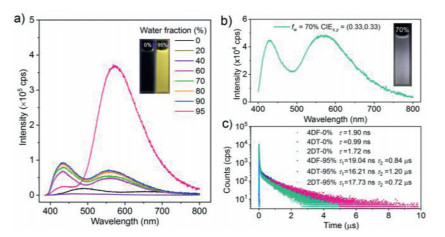 | Fig. 2. (a) PL spectra of 4DF in THF/H2O mixtures with different water fractions. The insets depict the fluorescent images of 4DF in THF/H2O mixtures with 0% and 95% water fractions, respectively. (b) PL spectra and the fluorescent image of 2DT in THF/H2O mixture with 70% water fraction. (c) Emission decay curves of the compounds in THF/H2O mixtures with 0% and 95% water fractions, respectively (Concentration: 0.1 mmol/L). | |