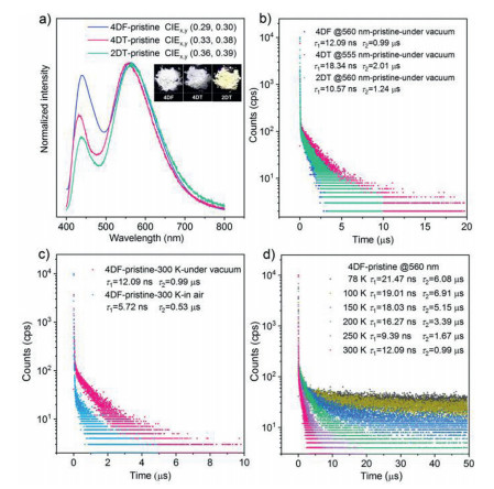 | Fig. 3. (a) PL spectra and CIEx,y chromaticity coordinates of the pristine samples. The insets depict the luminescence images of the pristine samples. (b) Emission decay curves for the yellow emission bands of the pristine samples under vacuum. (c) Emission decay curves for the yellow emission band of 4DF at 300 K under different atmospheres. (d) Emission decay curves for the yellow emission band of 4DF at different temperatures under vacuum. | |