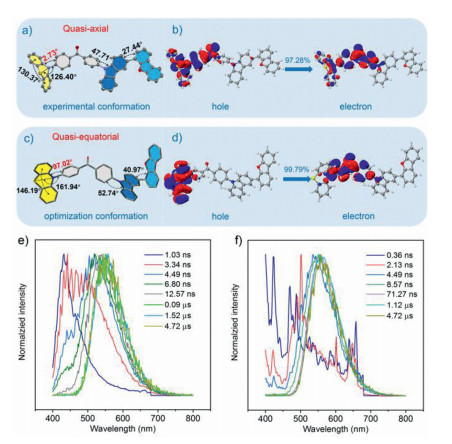 | Fig. 5. (a) Molecular conformation of 4DF in single crystal structure. (b) Natural transition orbitals of 4DF in quasi-axial conformation. (c) Molecular conformation of 4DF after optimization. The digits in (a) and (c) represent the bend and torsion angles. Taking the quasi-axial conformation as an example, the bend angle of the phenothiazine unit is 130.37°, while the torsion angle between the phenothiazine and its adjacent benzene ring is determined to be 2.73°. (d) Natural transition orbitals of 4DF in quasi-equatorial conformation. (e) Time-resolved emission spectra of the pristine sample of 4DF at 300 K under vacuum. (f) Time-resolved emission spectra of the ground sample of 4DF at 300 K under vacuum. | |