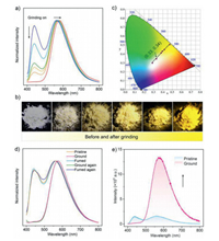 | Fig. 4. Mechanochromic properties of 4DF. (a) Changes of PL spectra of 4DF upon grinding. (b) Luminescent images of 4DF under the illumination of 365 nm UV light before and after grinding. (c) Changes of CIEx,y chromaticity coordinates of 4DF upon grinding. (d) Emission switching of 4DF realized by grinding and fuming treatments. The ground sample of 4DF were fumed in DCM vapor for about 20 min. (e) Force-induced emission enhancement of 4DF. | |