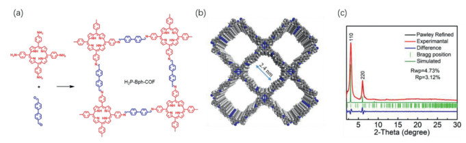 | Fig. 1. (a) Schematic representation of the synthesis of H2P-Bph-COF (HOAc, o-dichlorobenzene/n-BuOH, 120 ℃, 3 days). (b) Top view of the eclipsed structure proposed for H2P-Bph-COF (gray, C; blue, N; and white, H). (c) Indexed experimental (red), Pawley-refined (black), and simulated (green) PXRD patterns of H2P-Bph-COF. The difference plot is presented in blue. | |
