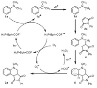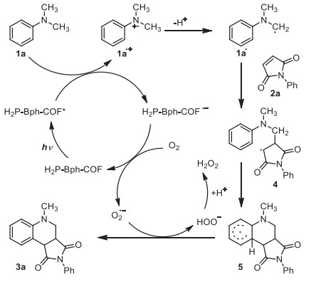 Based on above results and previous reports [22-33], we proposed the reaction mechanism for this transformation. As shown in Scheme 2, upon irradiation by visible-light, the H2P-Bph-COF was activated to its excited state H2P-Bph-COF*. The electron transfer from 1a to H2P-Bph-COF* led to the formation of 1a and H2P-Bph-COF• −. The generated H2P-Bph-COF• − further reacted with O2 to produce O2• −, accompanying the regeneration of H2P-Bph-COF. Meanwhile, the generated 1a further lose one proton to afford α-aminoalkyl radical 1a, which followed to react with 2a to produce radical 4. Subsequently, the generated 4 underwent cyclization to form intermediate 5. Finally, the oxidation and deprotonation of intermediate 5 assisted by O2• − afforded the desired product 3a, with the formation of H2O2.