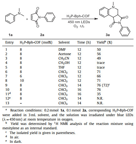 In summary, we report a metal-free porphyrin COF and its application in photocatalytic oxidative annulation reaction of N, N-dimethylanilines with maleimides. Upon visible-light irradiation, the metal-free H2P-Bph-COF can be a highly efficient heterogeneous and reusable photocatalyst to promote the formation of various substituted tetrahydroquinolines in moderate to good yields under mild conditions. We believe that the photoactive COF-based synthetic protocol herein not only provides a green and facile way to access tetrahydroquinolines synthesis, but also significantly expands the application scope of COF-based catalysts.