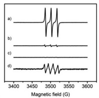 | Fig. 2. ESR measurements of (a) CHCl3 solution of H2P-Bph-COF and TEMP irradiated by blue LEDs; (b) CHCl3 solution of H2P-Bph-COF, 1a and TEMP irradiated by blue LEDs; (c) CHCl3 solution of H2P-Bph-COF and DMPO irradiated by blue LEDs; (d) CHCl3 solution of H2P-Bph-COF, 1a and DMPO irradiated by blue LEDs. | |