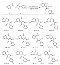 | Scheme 1. Scope of the H2P-Bph-COF catalyzed photocatalytic aerobic annulation reaction. Reaction conditions: 1 (0.2 mmol), 2 (0.1 mmol), 8 mol% H2P-Bph-COF, 3 mL CHCl3, blue LEDs (λ = 450 nm), 14 h, room temperature, in oxygen. Isolated yields are shown. | |