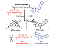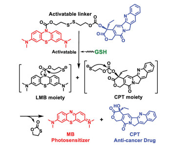 Herein, we report a novel GSH activatable "pro-drug-photosensitizer" (LMB-S-CPT) for the combination of PDT and chemotherapy with red light irradiation. LMB and camptothecin (CPT) are linked by disulfide bond to construct LMB-S-CPT. In health tissues or organs, non-cytotoxicity can be detected because the activity of both PS and drugs are inhibited in the presence of disulfide bonds. However, when the conjugate is uptaken by cancer cells, the disulfide bond is reduced by excessive GSH to release LMB and CPT. Subsequently, LMB is rapidly oxidized to MB which can generate 1O2 upon the red-light irradiation for PDT. LMB-S-CPT as a novel "pro-drug-photosensitizer" design, for the first time achieves the combination of chemotherapy and PDT.