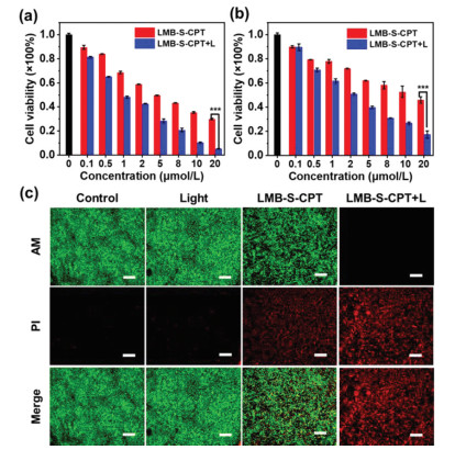 | Fig. 3. Cytotoxicity of LMB-S-CPT in MCF-7 cells (a) and 4T1 cells (b) with or without red light irradiation (660 nm, 10 mW/cm2, 10 min). (c) Confocal fluorescence images of live/dead cells. Scale bars: 400 μm. ***P < 0.001 determined by T-test. | |