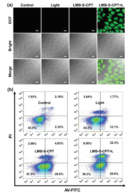 Subsequently, 2, 7-dichlorofluorescein diacetate (DCFH-DA) was used to track the intracellular 1O2 generation. DCFH-DA without fluorescence in living cells, can be hydrolyzed by intracellular esterase and further oxidized by ROS to generate 2, 7-dichlorofluoresce (DCF), emitting obvious fluorescence. The cells showed almost no fluorescence when treated with LMB-S-CPT in the dark. Upon the red-light irradiation, strong fluorescence was observed in the cells that were pre-incubated with LMB-S-CPT (Fig. 4a). The results revealed that the GSH-responsive LMB-S-CPT could generate 1O2 as an activable PS to achieve PDT. Next, annexin V-FITC (AV)/propidium iodide (PI) apoptosis detection kit was applied to reveal the stages of cells death after incubation with LMB-S-CPT with or without red light via flow cytometry. The cells with the lack of membrane integrity can be stained by annexin V-FITC, demonstrating that the cells were in the early stages of apoptotic. PI could only through the destroyed cell membrane, therefore, the cells of advanced apoptotic were selectively stained. When treated with LMB-S-CPT, the higher proportions of cells were in the early apoptosis stage compared to that of the control and light group (Fig. 4b). Upon red-light irradiation (660 nm, 10 mW/cm2, 10 min), the amounts of cells in the late and early apoptotic stages significantly increased, indicating that the combination of chemotherapy and PDT demonstrated the superior effect of killing tumor cells compared to sole chemotherapy (Fig. 4b).