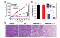 | Fig. 5. The changes of (a) tumor volume and (b) tumor weight after different treatments. (c) Images of H & E staining of tumor tissue after different treatments. Scale bars: 100 µm. ***P < 0.001 determined by T-test. | |
