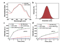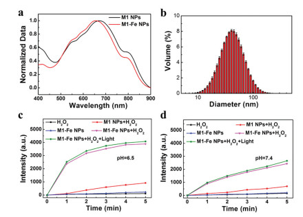 | Fig. 1. (a) Normalized UV-vis absorption spectra of M1 NPs and M1-Fe NPs. (b) DLS distribution of M1-Fe NPs. Average size is 59.7 ± 0.5. (c) Detection of produced •OH by different groups at pH 6.5 and (d) 7.4. | |