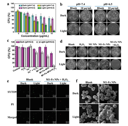 | Fig. 3. (a) Antibacterial activity of M1-Fe NPs with the aid of H2O2 under different concentration and pH conditions. (b) Corresponding bacterial plate images at killing concentration (10.0 µg/mL). (c) Antibacterial activity of different components at pH of 6.5 in dark or under irradiation and corresponding (d) bacterial plate images. (e) Fluorescence staining and (f) SEM images of S. aureus without and with treatment of M1-Fe NPs + H2O2 in dark or under irradiation. The scale bars are 20 µm in (e) and 1 µm in (f). Data are presented as mean ± SD (n = 3). The light is a 660 nm laser (1.0 W/cm2). The concentration of M1-Fe NPs is 10.0 µg/mL. The concentration of H2O2 is 1 mmol/L. | |