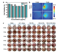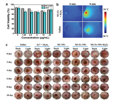 | Fig. 4. (a) Cell viability of EA.hy926 and 293T after treatment of M1-Fe NPs with different concentrations. (b) Infrared thermal images of infected wound of mice after different treatments (660 nm, 1.0 W/cm2). (c) Photographs of S. aureus-infected wounds of mice after 10-day treatment by various therapies. | |