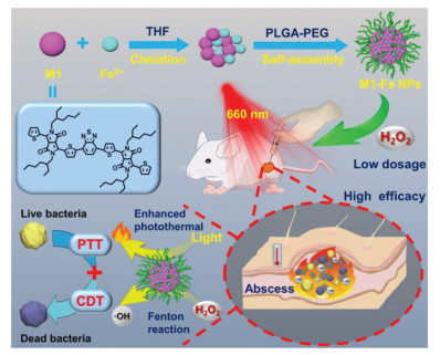 In summary, we have fabricated a multifunctional hybrid nano-assembly (M1-Fe NPs) based on conjugated oligomer M1 and Fe2+ for synergetic PTT/CDT antibacterial therapy. The introduction of Fe2+ not only increased the photothermal conversion property (increased 4 ℃ at 10.0 µg/mL), but also endowed the nanoparticles with catalytic capability of transferring H2O2 into stronger oxidant •, OH. Moreover, the generated heat could further accelerate the catalytic decomposition of H2O2 to kill more bacteria. Hence, upon light irradiation, the M1-Fe NPs could efficiently kill S. aureus with the aid of low dosage H2O2, which antibacterial effect was better than any other monotherapy. Finally, they also treated the S. aureus-infected wound of mice. This study offers a novel drug resistant antibacterial platform for effective, safe and synergistic anti-infective therapy.