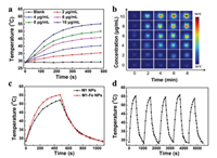 | Fig. 2. (a) Temperature changes and (b) infrared thermal images of M1-Fe NPs with different concentrations under light irradiation (660 nm, 1.0 W/cm2). (c) Temperature profiles of M1 NPs and M1-Fe NPs under the same experimental condition (660 nm, 1.0 W/cm2), respectively. (d) Temperature curve of M1-Fe NPs for 5 cycles of on/off light irradiation (660 nm laser, 1 W/cm2). | |