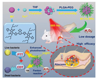 Although the generation of various antibiotics, the drug resistant bacterial infections still threaten the health of human being over the world [1-4]. It is emergent to develop effective antibacterial agents and antibacterial strategies to resist the evolution of bacteria and eliminate the damage from bacterial infections. By now, different kinds of materials have been developed to antibacterial agents relied on diverse antibacterial mechanisms [5-10]. Ag-based materials can kill bacteria by inhibiting replication through the binding of Ag ions with ATP synthetic enzymes [11]. Cationic polymers, quaternary ammonium salts, and antibacterial peptides can perturb and disrupt the cell membrane of bacteria to induce the death of bacteria [12-15]. Conjugated polymer [16-20], metal-organic frameworks [21-23], black phosphorus [24, 25], copper sulfide [26, 27], Au- [28-30] and carbon-based materials [31, 32] can generate reactive oxygen species (ROS) or heat under light irradiation to oxidize or damage phospholipids, proteins and even DNA to kill bacteria, which is involved in photodynamic therapy (PDT) and photothermal therapy (PTT). In addition, hydrogels are also developed as multifunctional anti-infective materials by combining above mentioned antibacterial mechanism with ability of tissue repair [33]. However, there are still some disadvantages in current antibacterial agents for practical antibacterial therapy, such as low antibacterial ability and long-term cytotoxicity, and it remains a challenge to develop highly effective antibacterial agents and strategies with low biological toxicity and little possibility to trigger drug resistance.