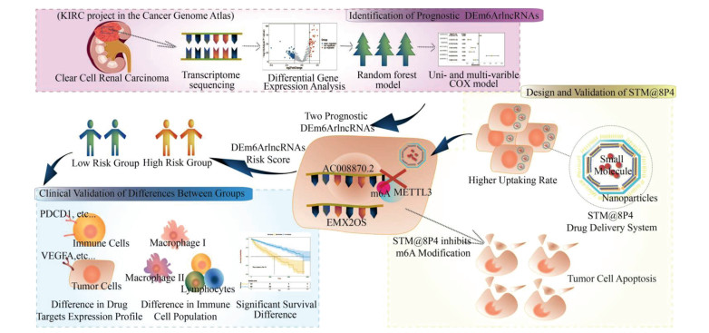 | Fig. 1. Illustrations depicting the three major parts of the design, including identification of prognostic DEm6ArlncRNA, clinical validation of differences between the two risk groups and design and validation of STM@8P4 NPs. | |