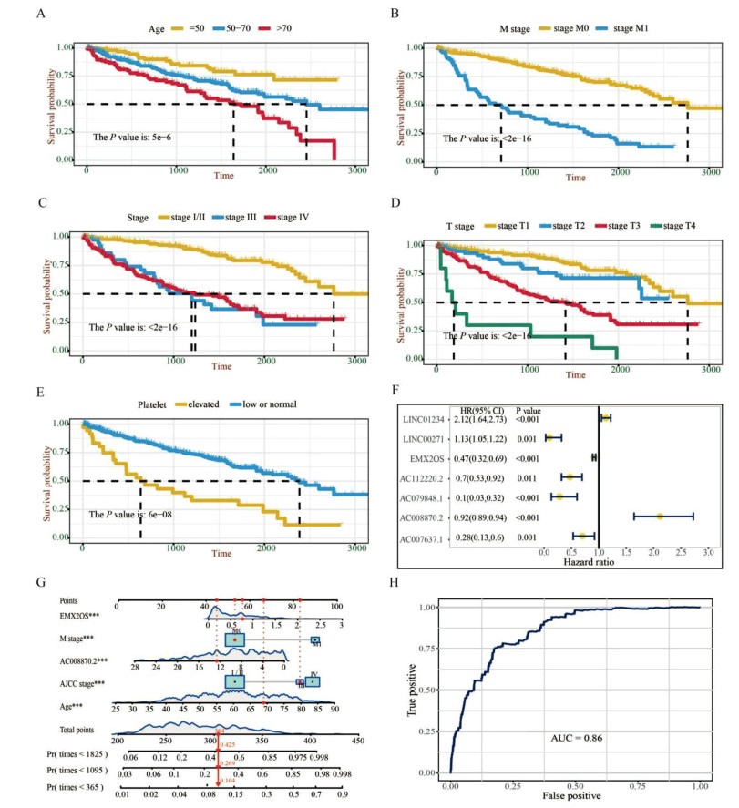 | Fig. 2. The selection of prognostic factors for ccRCC patients. (A-E) Kaplan-Meier curves showing that patients with different characteristics of selected clinical variables had different overall survival. (F) A forest map showed 7 selected m6ArlncRNAs after 1000 times random forest model. (G) A constructed nomogram for predicting overall survival in ccRCC patients. Red lines and dots show a specified patient's point. (H) The AUC of nomogram model in predicting 1-year overall survival of ccRCC patients. | |