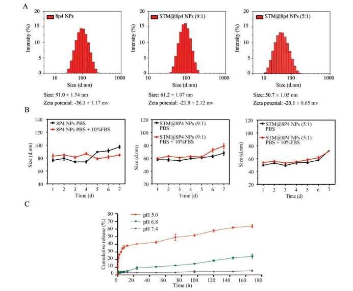 | Fig. 3. The characterization of STM@8P4 NPs. (A) Particle size distribution of 8L6 and STM@8P4 NPs. (B) Stability of STM@8P4 NPs. (C) Drug release behavior of STM@8P4 NPs in different pH solutions. | |