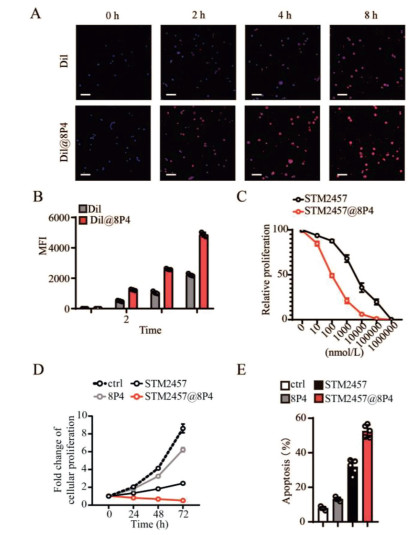 The uptake efficiency of chemotherapeutic drugs by tumor cells is an important factor in tumor killing efficiency. Therefore, in order to observe the uptake of 8P4 by renal clear cell carcinoma cells, we treated 786-O cell lines with Dil and Dil@8P4 to observe the intracellular drug content, found that 8P4 is very easily taken up by the 786-O cell line (Fig. 4A, quantification in Fig. 4B). To explore the therapeutic effects of STM@8P4 NPs in vitro, we treated 786-O renal clear cell carcinoma cells with 8P4, STM2457, and STM@8P4 NPs, respectively. Our data showed that STM@8P4 NPs efficiently inhibited 786-O cell proliferation more efficiently than STM2457 treatment at 72 h post-treatment (Figs. 4C and D). Furthermore, STM@8P4 NPs induced more dramatic apoptosis in 786-O cells than STM2457 treatment (Fig. 4E). In order to better study whether STM@8P4 NPs improve the toxicity of STM2457 renal clear cell carcinoma cells, we administered 0-106 nmol/L drug treatment to the 786-O cell line and found that STM@8P4 NPs can reduce the IC50 of STM2457 against renal clear cell carcinoma cell lines from 6783 nmol/L to 98 nmol/L.