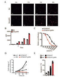 | Fig. 4. Pharmacological inhibition of STM@8P4 NPs in renal clear cell carcinoma cells. (A) Representative images and quantification (B) of Dil uptake in 786-O cells (Scale bar = 20 µm). (C) Dose-response curves of a 786-O cells panel to STM2457 and STM@8P4 NPs. (D) The cell proliferation rate of 786-O cells incubated with PBS (Ctrl), 8P4, STM2457, and STM@8P4 NPs (n = 5 independent replicates per group). (E) Apoptotic 786-O cells at 72 h after indicated treatment (n = 5 independent replicates per group). | |