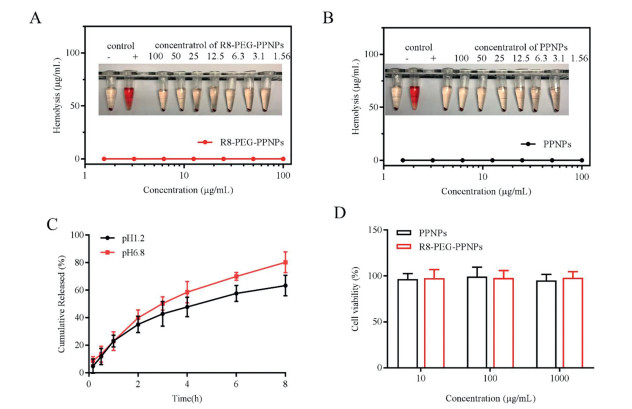 | Fig. 1. Hemolysis of (A) PPNPs and (B) R8-PEG-PPNPs. (C) In vitro release curve of R8-PEG-PPNPs at 37 ℃. Values are mean ± SD (n = 3). (D) The cytotoxicity of nanoparticle carriers on activated RAW 264.7. Values are mean ± SD (n = 6). | |