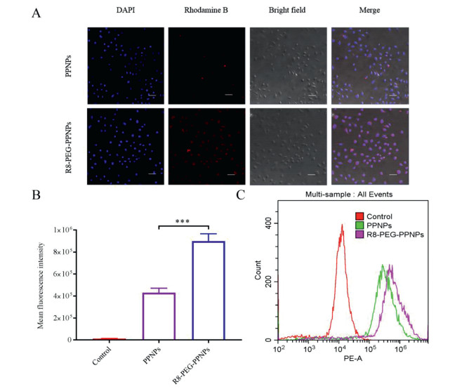 And later, further quantitative analysis was performed by flow cytometry (EPICS XL). The results showed that the Control group had the lowest intracellular fluorescence intensity (Figs. 2B and C). Phase uptake was significantly higher in the R8-PEG-PPNPs group compared with the other groups (P < 0.001). This is consistent with the CLSM observations and validates that R8 and PEG promote the uptake of inflammatory cells.