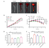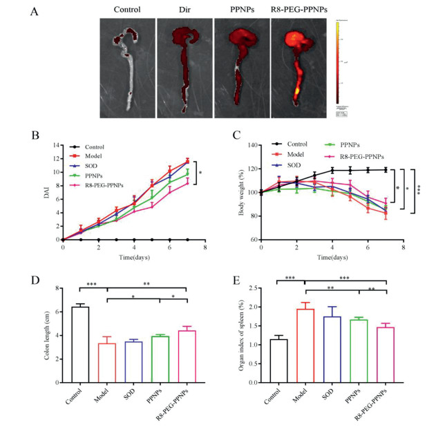 Before examining the efficacy of NPs in vivo, we studied the distribution of NPs constructed by Dir in vivo tissues. All animal care and experiments are carried out in accordance with the guidelines for the humane treatment of experimental animals in Jilin University (Nos. SY202012023 and SY202105016). Ulcerative colitis model is a common inflammatory bowel disease induced by oral administration of 3% dextran sodium sulfate (DSS) aqueous solution for 7 days. Twelve hours after oral administration of the drug, we observed the fluorescence distribution in mice (Fig. 3A). The weaker fluorescence intensity of the Dir group indicates that Dir is difficult to be digested and absorbed into the body. In contrast, the R8-PEG-PPNPs group showed stronger fluorescence intensity at the site of inflammation than the other groups. Some studies indicate that the NPs lodge in intestinal tract and release drugs that can treat the colon [33-35]. As the above experimental results show, most of our NPs are concentrated in the colon.