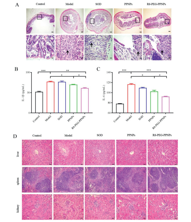 After the mice were euthanized, we performed a pathological analysis of the colonic tissues of the mice in the different treatment groups (Fig. 4A). The negative control sections had clearly visible cup cells and minimal inflammatory cell infiltration. In contrast, colon sections from untreated mice with ulcerative colitis showed intestinal epithelial necrosis, lamina propria hyperplasia, loss of cupped cells, and a large infiltration of inflammatory cells. Compared to other treatment groups, R8-PEG-PPNPs administration was better at reducing inflammatory cell infiltration and effectively preventing mucosal epithelial cell necrosis and lamina propria proliferation. The results further suggest that R8-PEG-PPNPs have a palliative effect on ulcerative colitis in mice. Mice treated with SOD did not significantly improve the histological features of colitis.