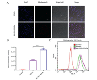 | Fig. 2. (A) Intracellular distribution of NPs in RAW 264.7 cells by CLSM (200×; scale bar: 50 µm). (B) Representative flow cytometric curves. Values are mean ± SD (n = 3, ***P < 0.001). (C) Quantitative data of flow cytometric. | |