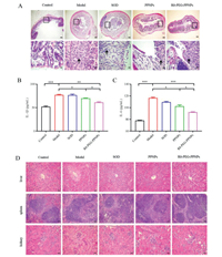 | Fig. 4. (A) H & E-stained pathological sections of colonic tissues from different groups. (40×, 400×; Scale bars: 200, 20 µm). Expression levels of IL-1β (B) and IL-6 (C) in mouse plasma. Values are mean ± SD (n = 6, P < 0.05, **P < 0.01, ***P < 0.001). (D) H & E sections of the liver, spleen and kidney in ulcerative colitis mice (200×; Scale bar: 50 µm). | |