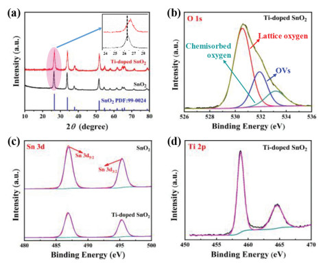 | Fig. 2. (a) XRD patterns of SnO2 and Ti-doped SnO2 and XPS spectra for (b) O 1s, (c) Sn 3d and (d) Ti 2p. | |